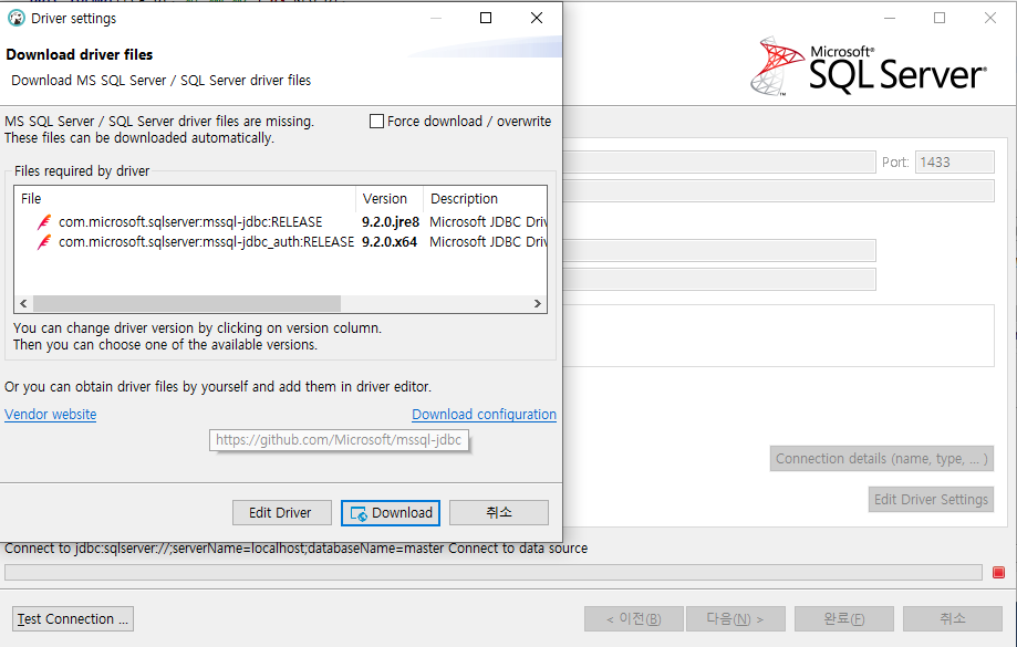 - Test Connection 을 누르니 필요한 driver 를 다운받으라는 창이 뜹니다. 진행해보겠습니다.