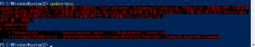 get-help를 처음 쳐보니 도움말을 보려면 온라인으로 접근하거나, 관리자 권한으로 실행 후 다운로드 설치가 필요하다고 합니다. 어차피 powershell에서 도움말을 확인할 테니 다운로드하겠습니다.