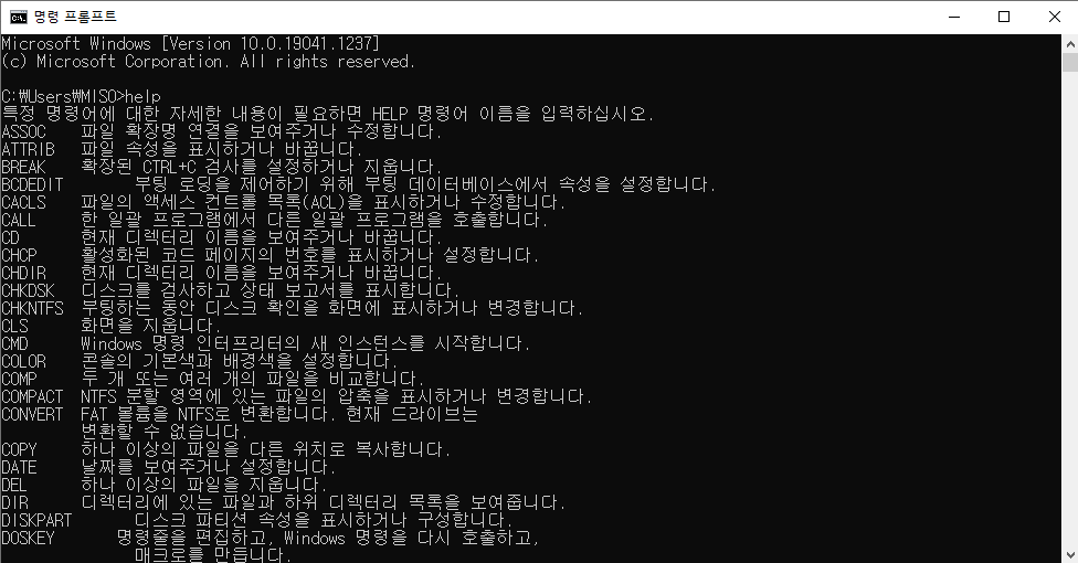 cmd도 명령어 인터프리터이지만 cmd에서 help를 치면 powershell보다 적은 명령어 개수를 확인할 수 있습니다.