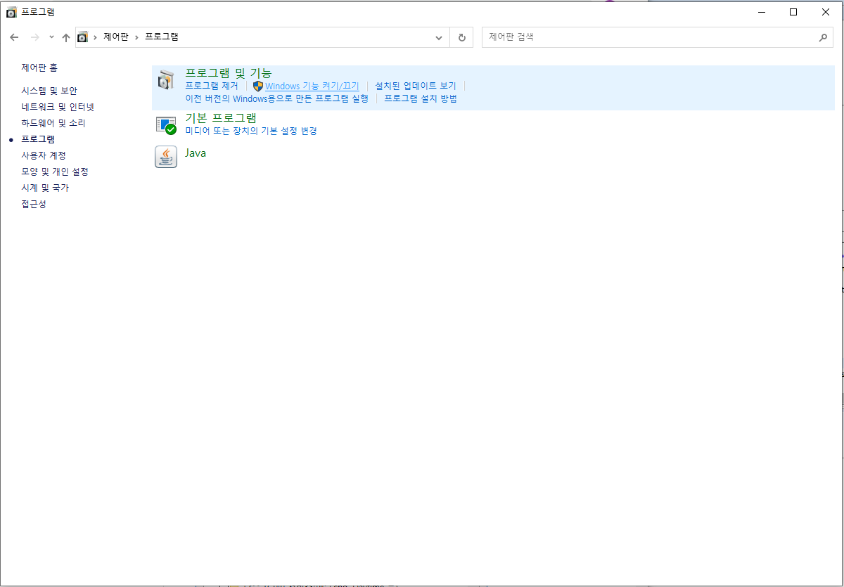 2. 프로그램 및 기능에서 Windows 기능 켜기/끄기를 클릭합니다.
