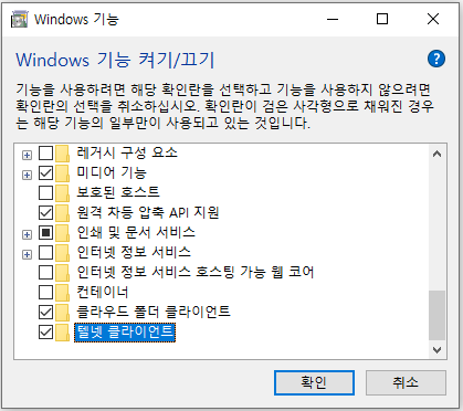3. 텔넷 클라이언트 체크박스를 체크 후 확인을 눌러주세요.