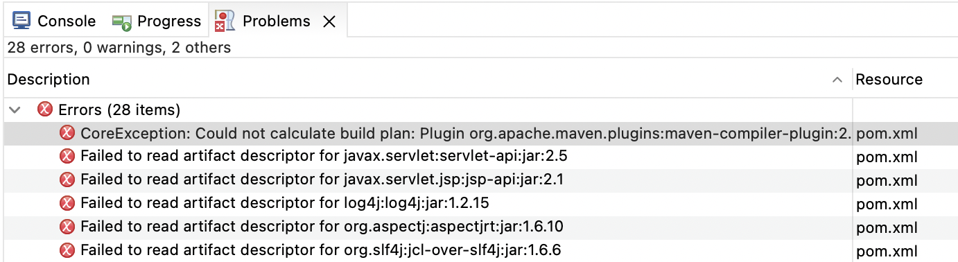Spring Tool Suite 3(STS)를 이용해 Spring 프로젝트를 생성했는데 pom.xml에서 Errors가 발생했습니다.