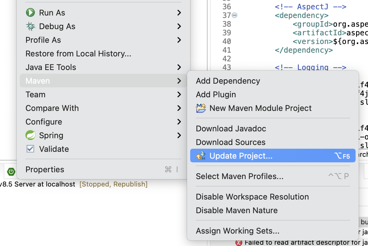1. 먼저 project maven update를 해줍니다. 프로젝트 우클릭 > Maven > Update Project... 를 클릭합니다.
