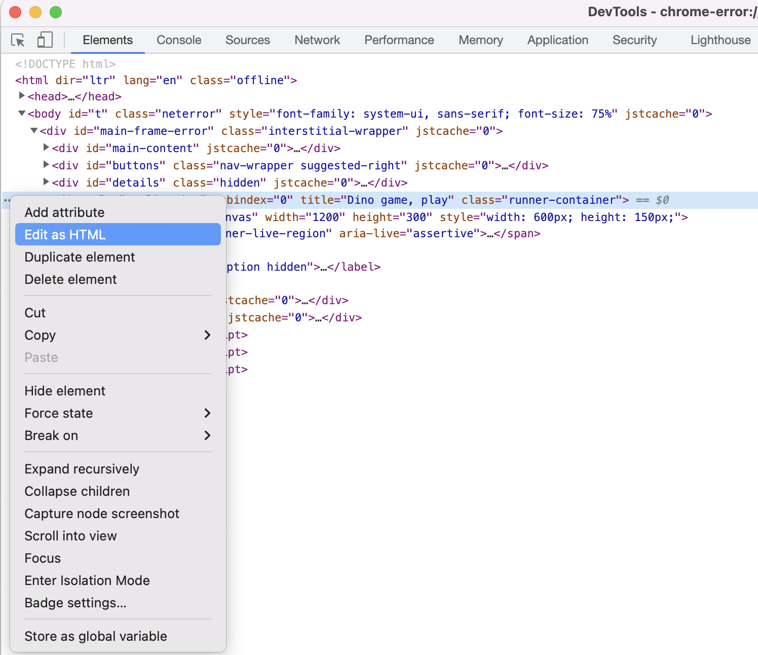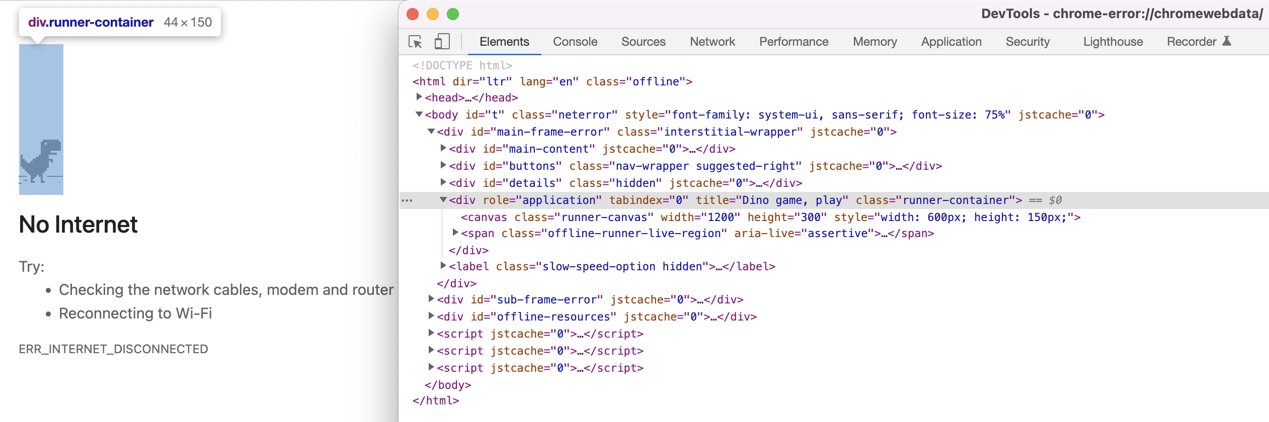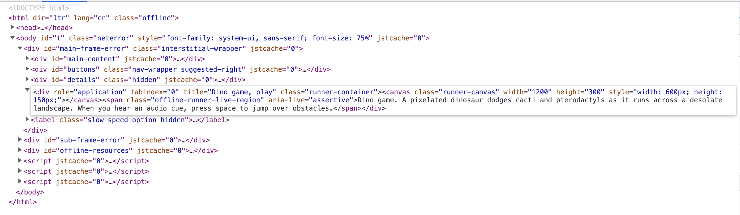 No Internet 이면 No Internet이지 저 공룡은 뭔가 싶어서 개발자 도구 (F12 / mac은 fn + F12)로 공룡을 찾아봤습니다.