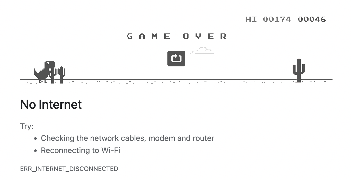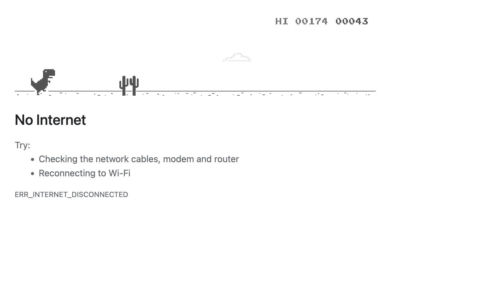 그래서 스페이스바를 눌러보니 갑자기 공룡이 뛰기 시작하며 선인장이 나옵니다.