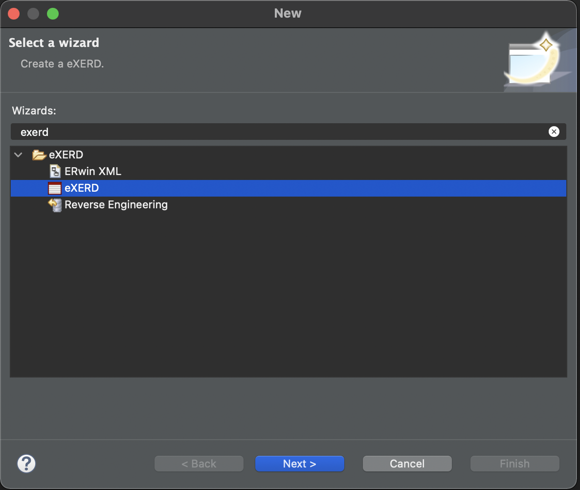 new 창이 열리면 exerd 를 검색하고 eXERD 파일을 선택 후 next 를 누른다.