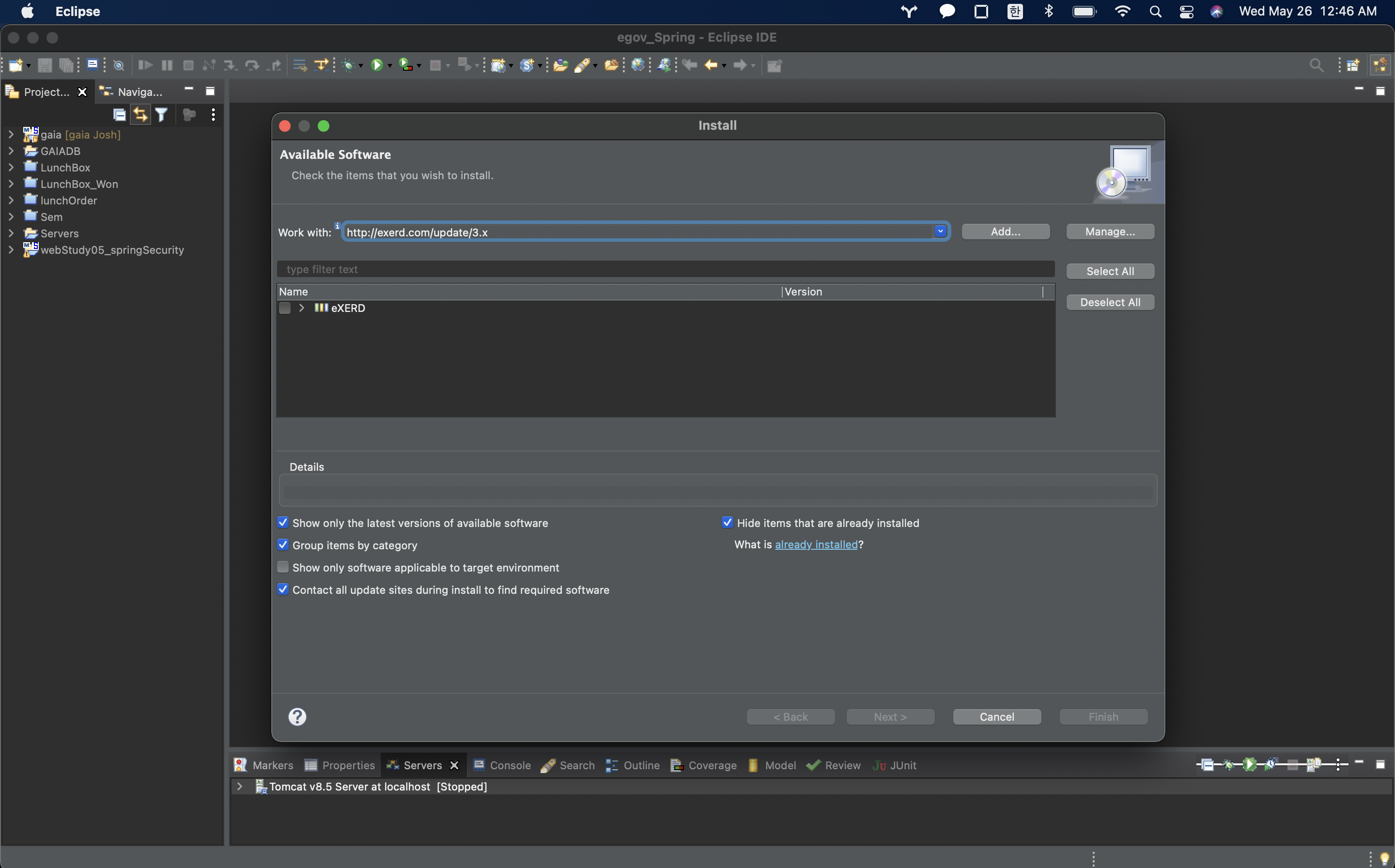 Work with 에 http://exerd.com/update/3.x 를 입력하고 아래 뜬 exerd 를 선택 후 next 를 누르면 설치 시작