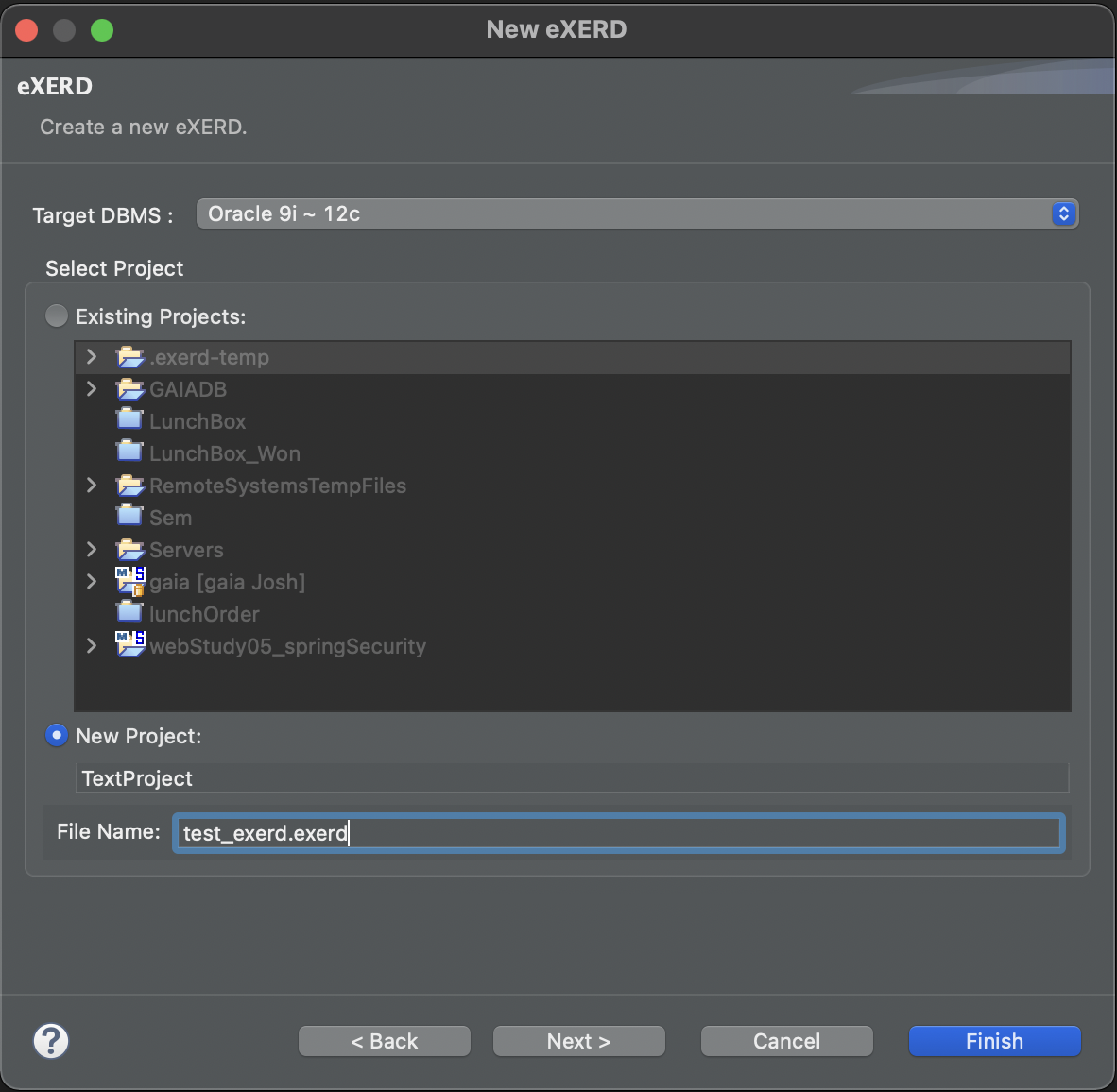 Target DBMS 를 본인이 사용하고 있는 DBMS 로 설정하고 기존 프로젝트나 새로운 프로젝트를 생성해서 exerd 파일을 만들 수 있다.