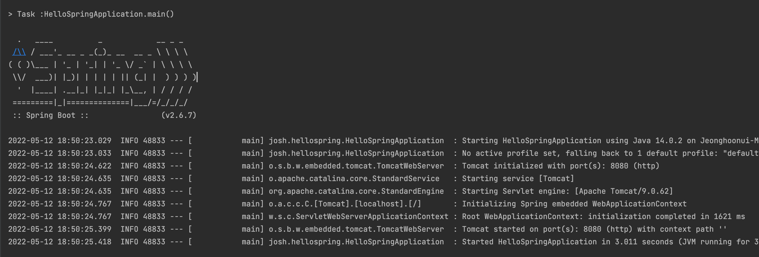 프로젝트 생성 후 main을 실행시켜서 가상 tomcat의 8080 port 가 실행되었습니다.