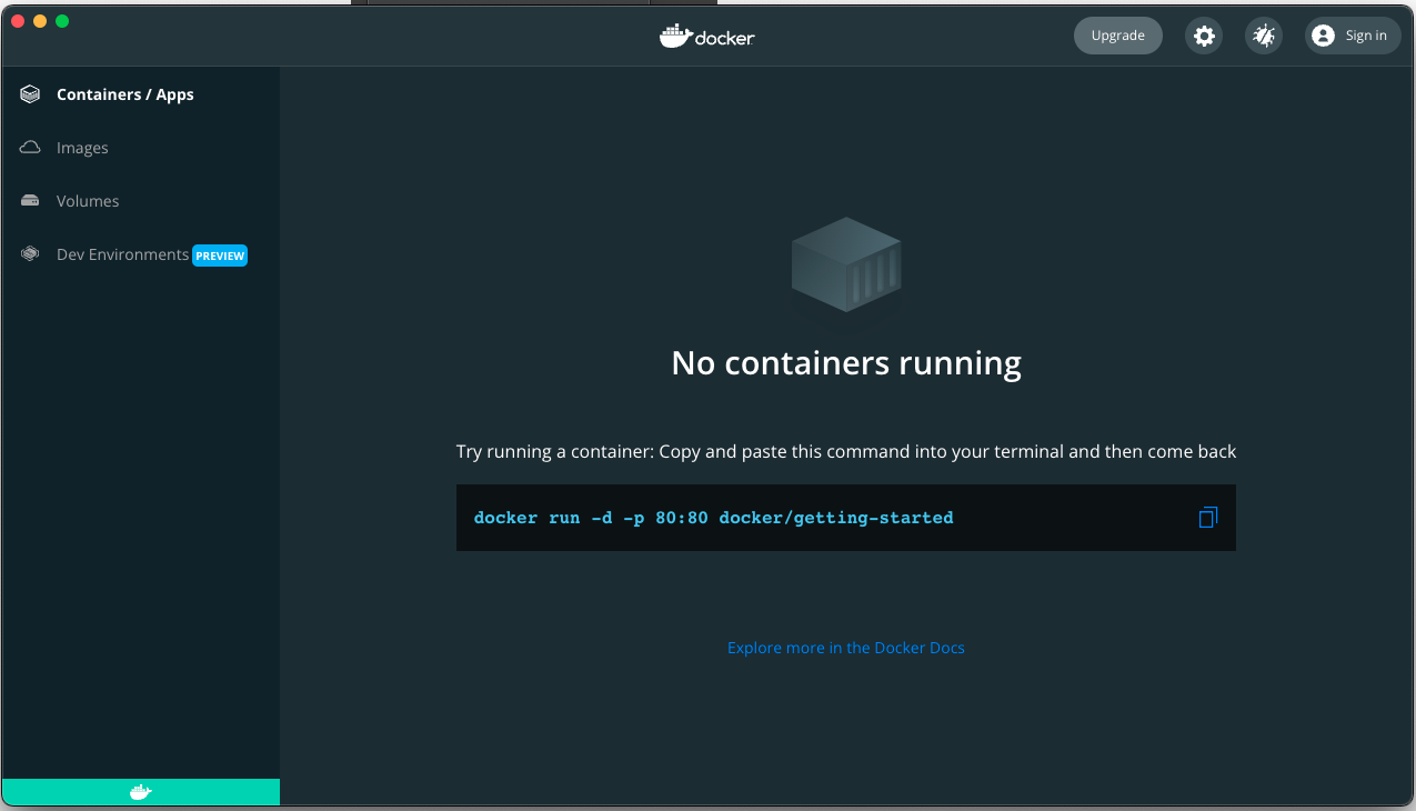 아직 컨테이너를 생성하지않았기 때문에 No containers running 이라고 나옵니다.
