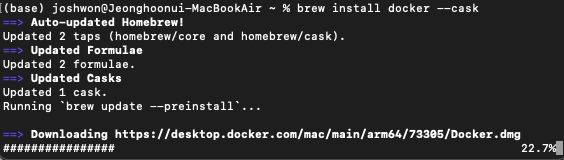 1. 터미널에서 brew install --cask docker 를 입력합니다.